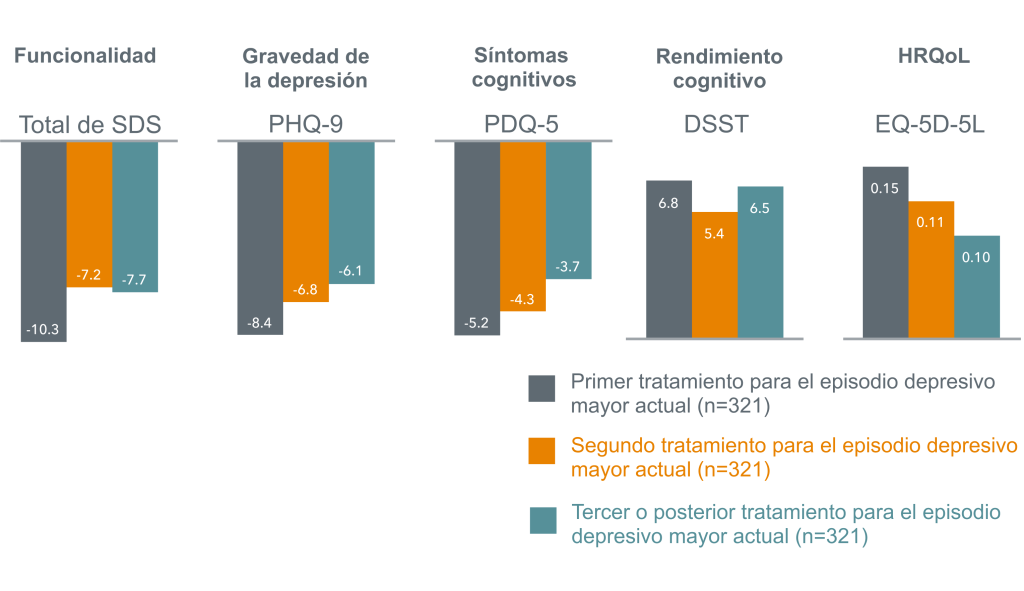Cambio desde el inicio hasta la semana 24 en funcionalidad, gravedad de la depresión, síntomas y desempeño cognitivos, y calidad de vida relacionada con la salud por línea de tratamiento según la línea de tratamiento con Brintellix®.