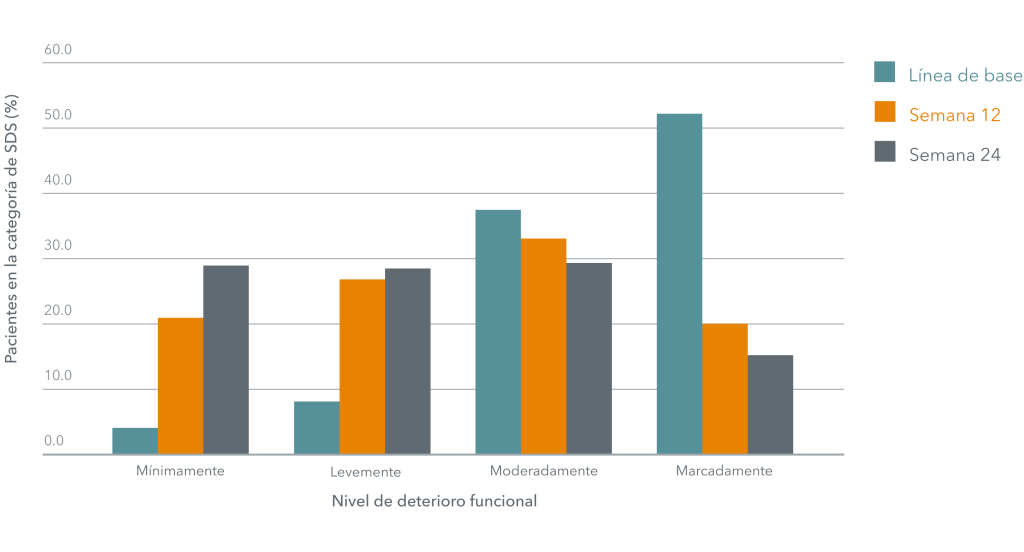 Cambios en el deterioro funcional (categorías de puntuación total de SDS‡) durante 24 semanas en la práctica clínica habitual